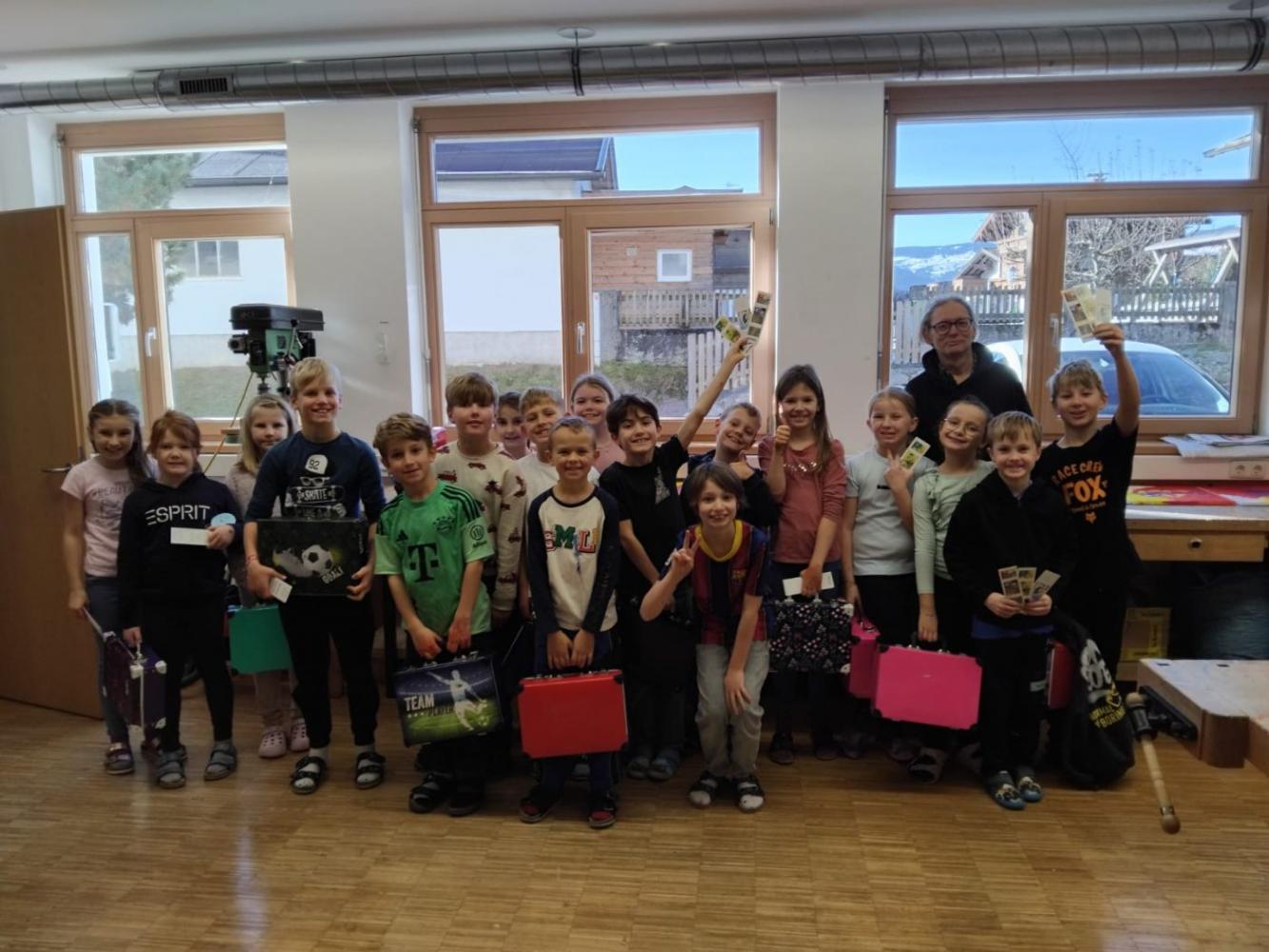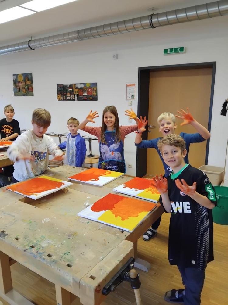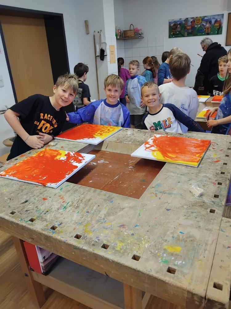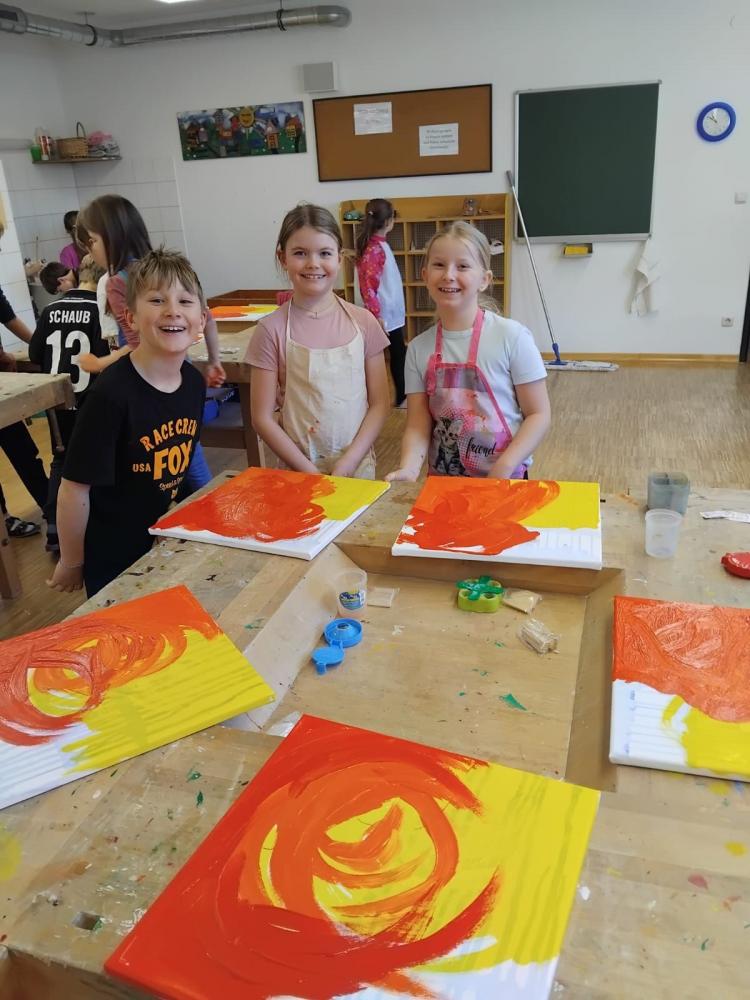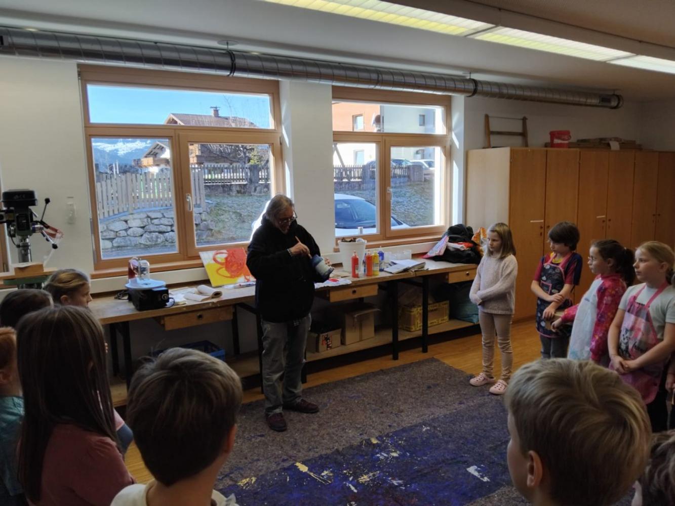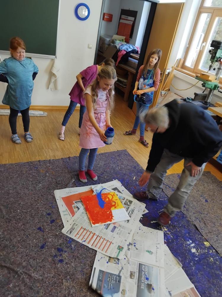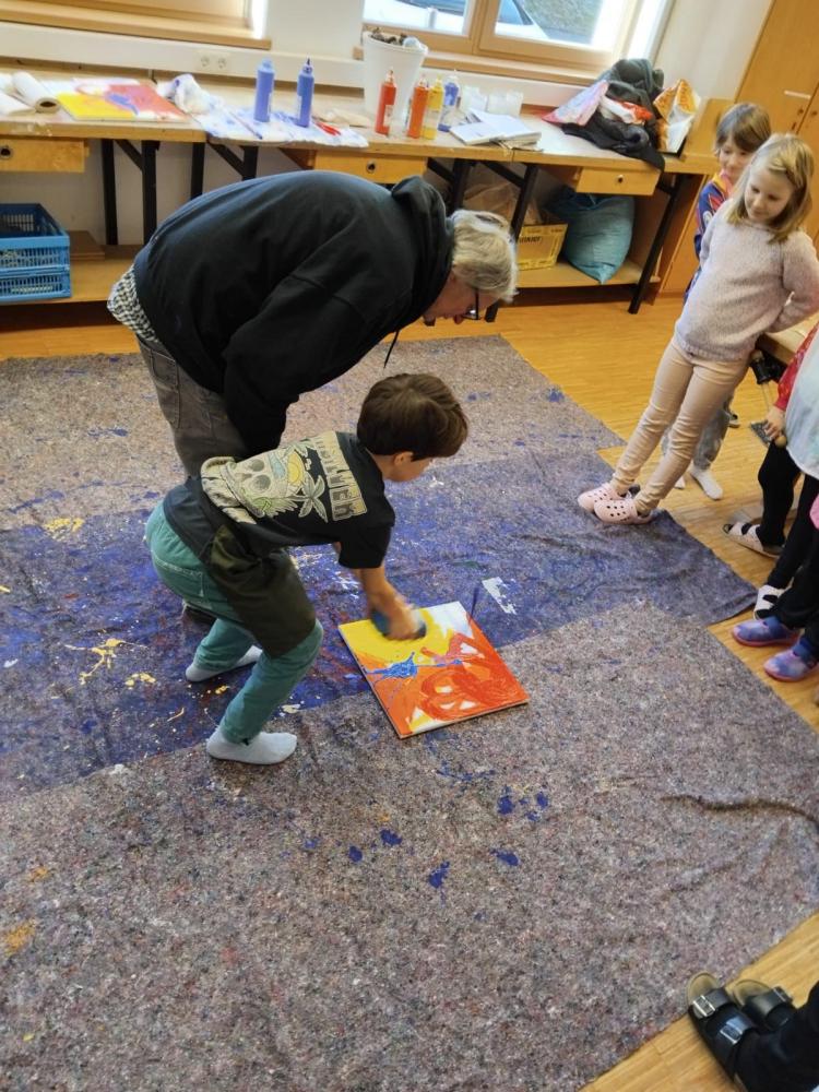 Künstler Pemsel vom Tiroler Kulturservice malte mit den Schülern und Schülerinnen der 3a abstrakte Acrylbilder auf Leinwand.