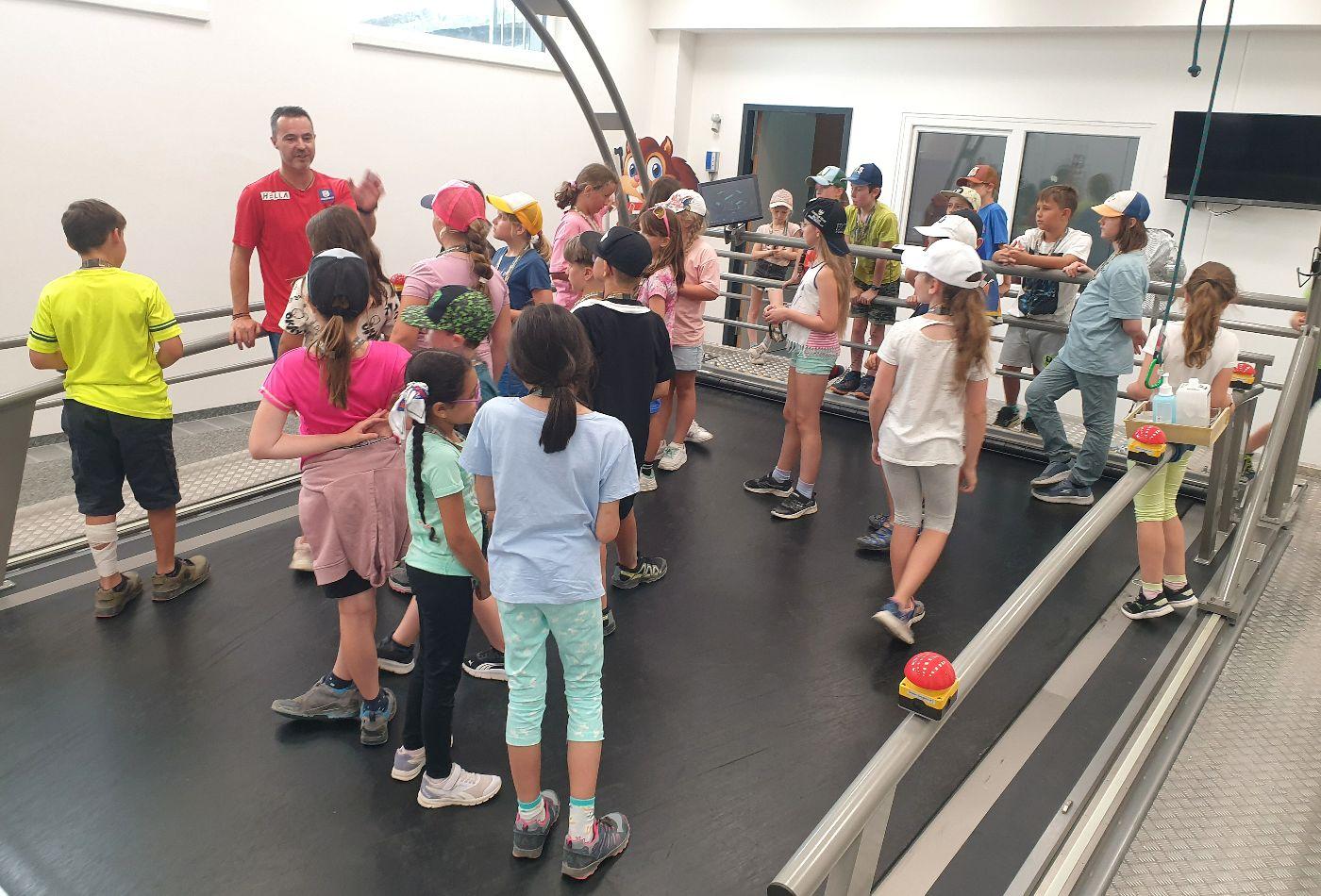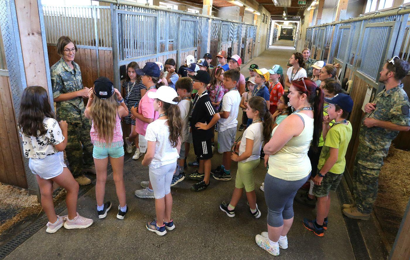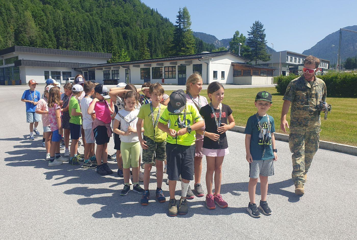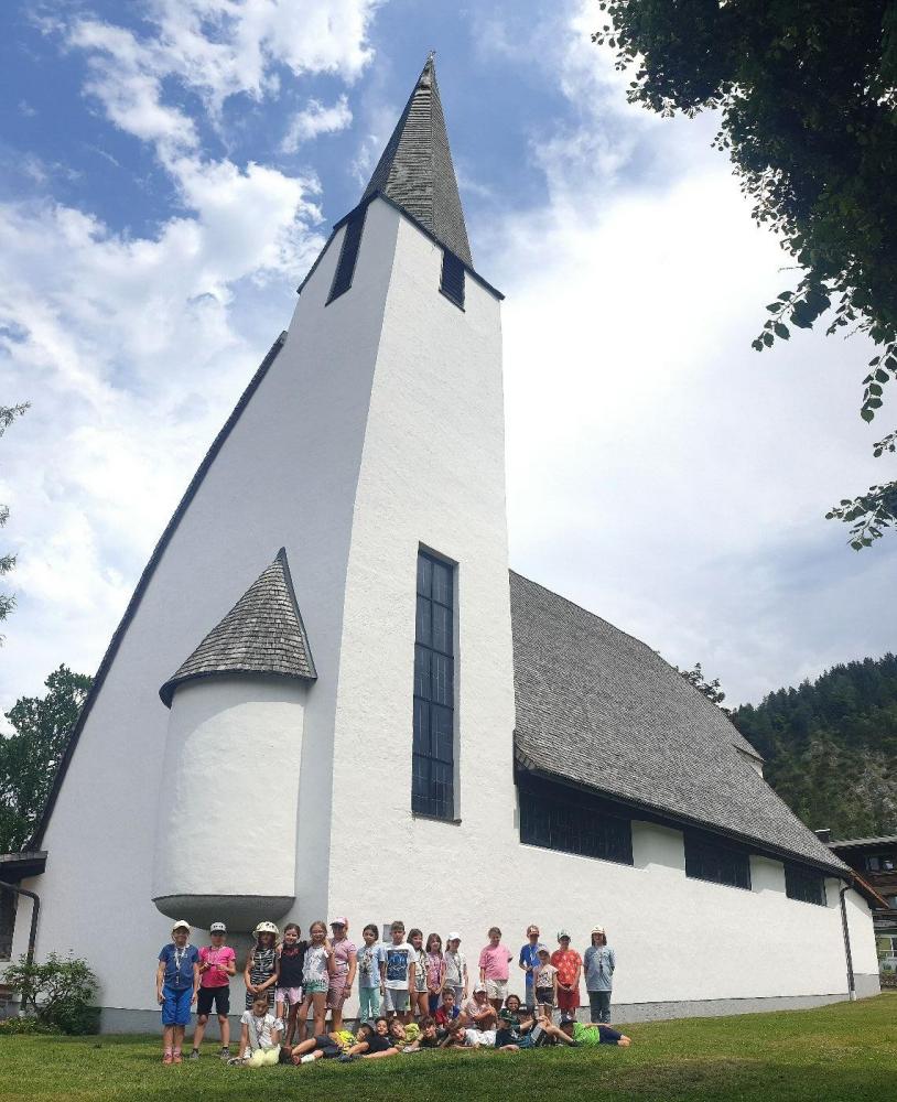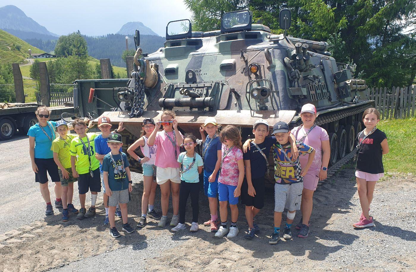 Langsam meldete sich der Hunger und so steuerten wir das nächste Ziel an - den Truppenübungsplatz Hochfilzen in der höchstgelegenen Gemeinde unseres Bezirks. Nach einer ausgiebigen Stärkung im Speisesaal der Soldaten führte uns der sympathische Heeresbergführer Roland Trutschnig durch das Gelände. Wir besichtigten die Stallungen der Haflingerpferde, welche die Kinder ganz besonders ansprachen. Die kräftigen und genügsamen Tiere werden aufgrund ihrer hohen Trittsicherheit im Gebirge eingesetzt, wenn es mit Fahrzeugen nicht mehr weitergeht. Nach einem Rundgang durch die Biathlon-Wettkampf-Einrichtung setzten wir unsere Fahrt über St. Ulrich am Pillersee und Waidring fort, rauschten an den eindrucksvollen Kalkgebirgen der Leoganger und Loferer Steinberge sowie der Steinplatte vorbei, einem riesigen Korallenriff aus der Triaszeit. In Erpfendorf machten wir eine kurze Einkehr in die Holzmeister Kirche und stellten große Unterschiede zur eindrucksvollen Barockkirche von St. Johann fest.